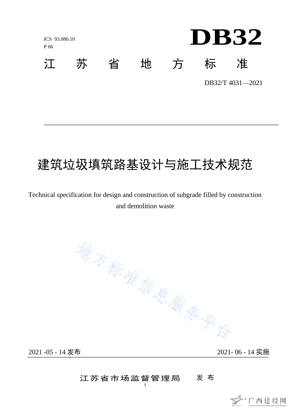 DB32 T4031-2021建筑垃圾填筑路基設計與施工技術規范
